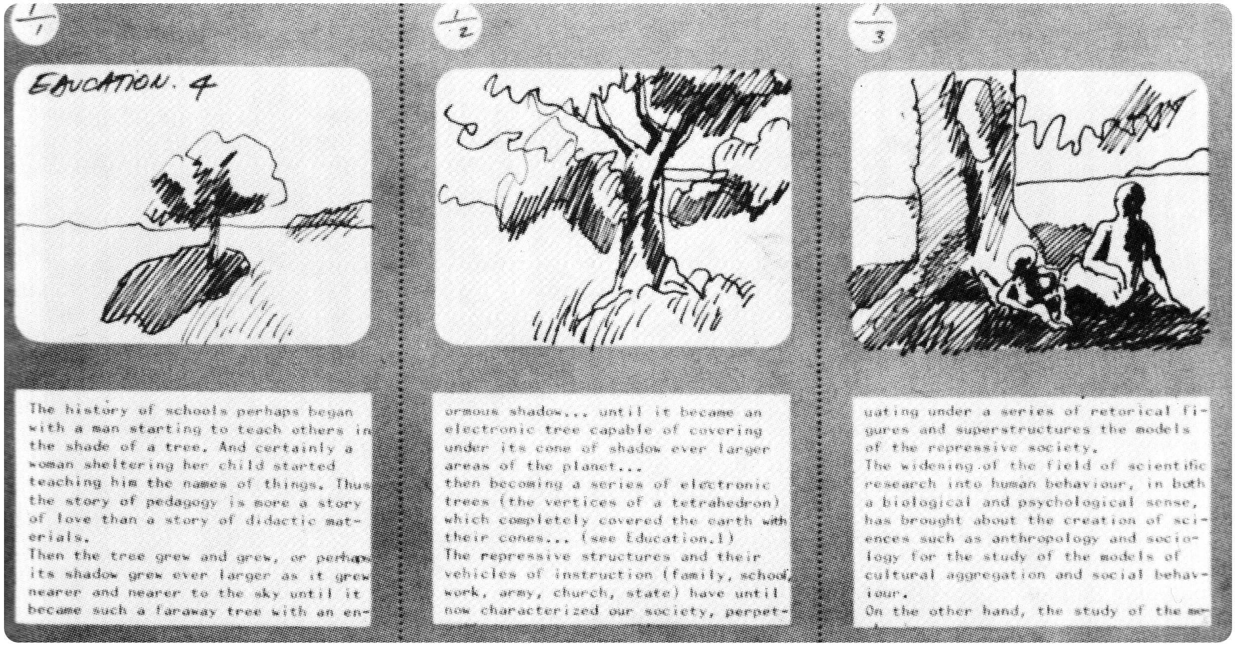 — Superstudio, Five Fundamental Acts: Education. Storyboard of Life, Education, Ceremony, Love, Death: Education 4 (1972) [Gender alterations by In the shade of a tree]